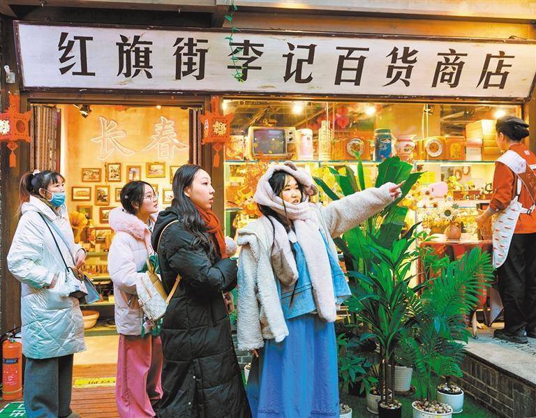 1月10日,“这有山”内,相沿主题的红旗街李记百货商店眩惑旅客前来参不雅选购。
