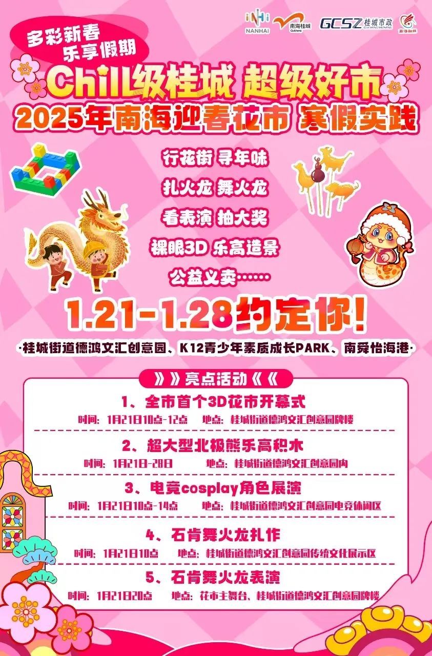 1月21日-28日,2025年南海迎春花市将在全新地址——桂城街说念、、举行,精彩亮点活动一日接一日,家长们快为孩子安排起来吧!