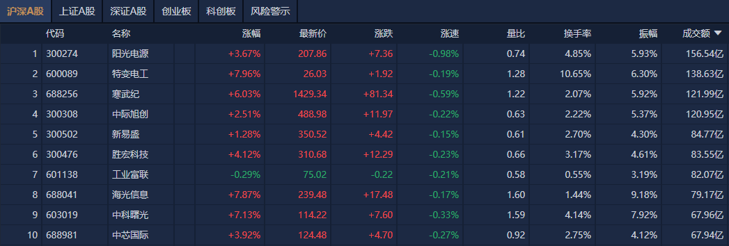个股方面,阳光电源成交额超156亿元居首,特变电工、寒武纪、中际旭创成交额靠前。