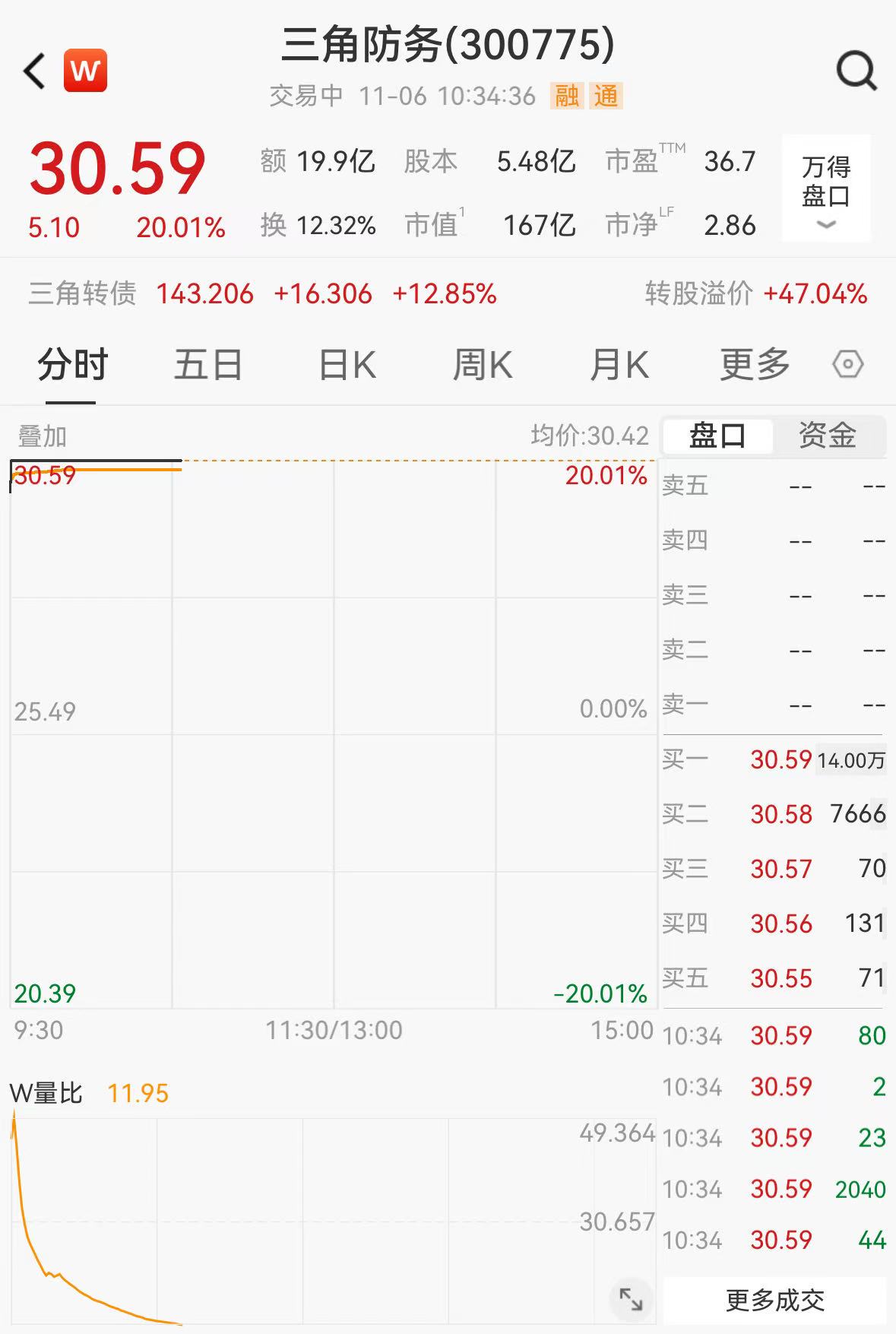 11月6日,军工铸造龙头三角防务(300775.SZ)20cm涨停,报30.59元/股,股价创年内新高。