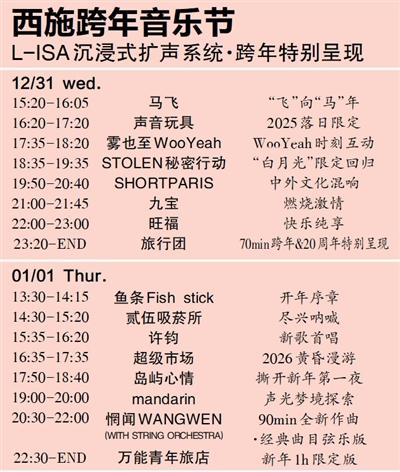 2025年终末的夜晚,咱们将带着我方的故事向西施滩汇注,在音乐的声浪中一齐倒数高歌。12月31日晚,将有马飞、声息玩物、雾也至WooYeah、STOLEN深邃当作、SHORTPARIS、九宝、旺福、旅行团8组艺东谈主出场,来陪你渡过2025年的终末一晚。