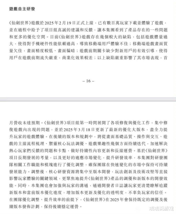 看了下其他几个骨子主要有:仙剑寰宇首月活水未达预期、玩家流失严重、形势组裁人、“会守护2025更新”、倡导收回前期参加资本、仙剑三动画2025年内推出、仙剑四动画正在立项制作中。