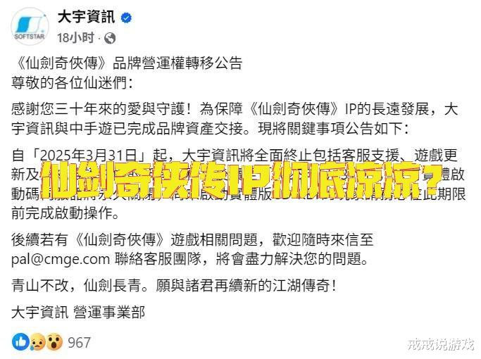 最近一则游戏IP振荡的公告,勾起了N多玩家的好意思好回忆。大宇秘书已与中手游完成《仙剑》IP移交,3月31日起全面拒绝联系就业,5月31日将遥远关闭原有的激活码就业器。大宇资讯出品的游戏品牌也有不少是照旧很热点的,仙剑奇侠传系列、轩辕剑系列、大大亨系列等,此次品牌财富的移交也意味着中手游已拿下《仙剑奇侠传》全球版权。让大量玩家印象潜入的李放荡和赵灵儿也要换东家了,让东说念主不堪唏嘘。