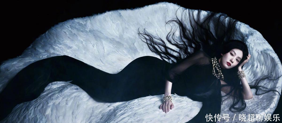 如水波纹般的黑纱包裹全身,如墨般长发铺散在白色翅膀造型的床上,通盘东说念主就像暮夜天神凝望着镜头。