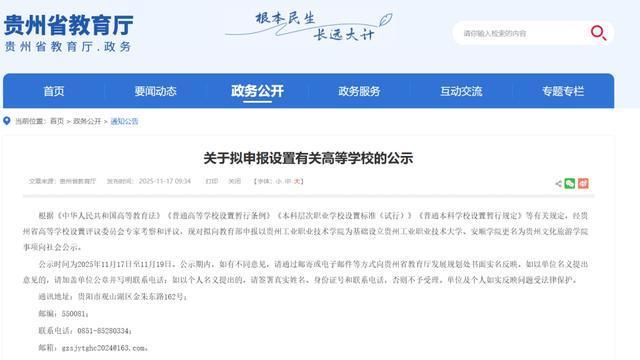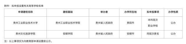 贵州省老师厅发布《对于拟请教竖立相关高级学校的公示》。凭据《中华东说念主民共和国高级老师法》《粗犷高级学校竖立暂行条例》《本科档次做事学校竖立行径(试行)》《粗犷本科学校竖立暂行规章》等相关规章,经贵州省高级学校竖立评议委员会众人教师和评议,现对拟向老师部请教以贵州工业做事手艺学院为基础建立贵州工业做事手艺大学、安顺学院改名为贵州文化旅游学院事项向社会公示。