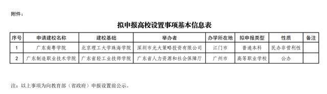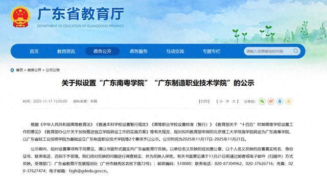 广东省老师厅发布《对于拟竖立“广东南粤学院”“广东制造做事手艺学院”的公示》,凭据《中华东说念主民共和国高级老师法》《粗犷本科学校竖立暂行规章》《高级做事学校竖立行径(暂行)》《老师部对于“十四五”时分高级学校竖立使命的成见》《老师部办公厅对于加速鞭策沉静学院转设使命的践诺决议》等相关规章,现对拟向老师部请教的北京理工大学珠海学院转设为广东南粤学院、以广东省轻工业技师学院为基础建立广东制造做事手艺学院等2个事项赐与公示。